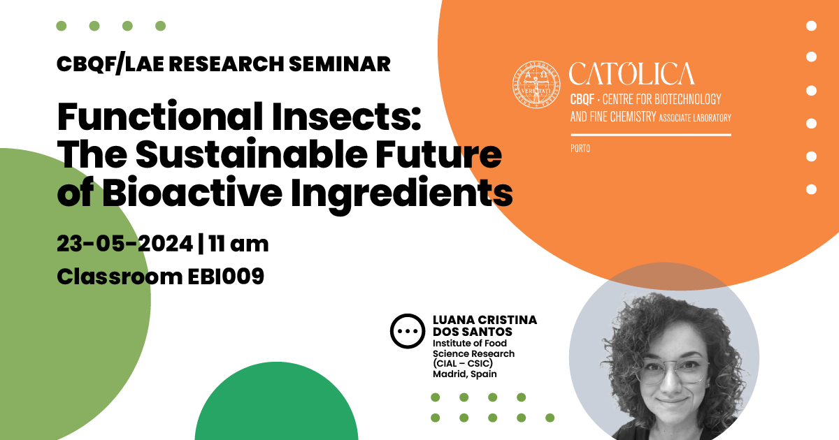 The CBQF/LAE Research Seminar "Functional Insects: The Sustainable Future of Bioactive Ingredients" with Luana Cristina dos Santos researcher at the Institute of Food Science Research (CIAL – CSIC), Madrid, Spain, will take place on May 23, at 11:00 am, in classroom EBI009, in the Biotechnology Building.